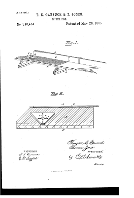 | "This invention relates to an attachment for miter-boxes, especially of the Langdon class, and the objects of the same are to provide suitable adjustable means for holding molding material of different widths in position while being sawed, and to provide a measuring-scale properly graduated, by means of which the exact length of molding may be readily ascertained and a uniformity of length in the manufacture of picture-frames obtained." |