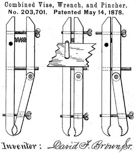 | A solid bar with a firmly attached perpendicular guide rod, a compression spring, two threaded holes in the same plane as the guide rod, and a larger hole perpendicular to the guide rod and ends shaped as flat and curved jaws. A hinged bar with similar jaw faces, and holes for the guide rod and two thumb screws. Simple and effective. |