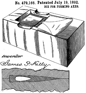 | Forging dies that form axe heads with indented side panels for labels or other identifying markings. |