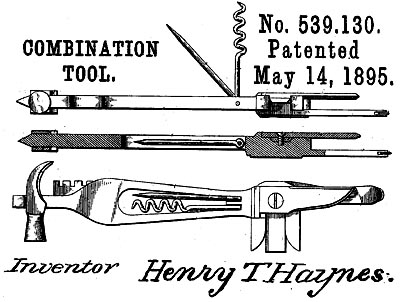| Household combination tool with tack hammer, tack puller, saw set, can opener, knife and scissors sharpener, screw driver, fold-out awl and corkscrew, and glass cutter. |