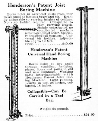 | "Henderson's Patent Joint Boring Machine" and the similar "Henderson's Patent Universal Hand Boring Machine" were sold by Chicago hardware retailer H. Channon Co. We found some data points showing that it was manufactured by the Henderson Electric Co., of Ampere, NJ. |