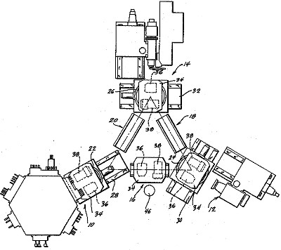 | The patent covers a machining "system" consisting of an open loop of stand-alone machines where the workpiece is passed from one machine to the next to perform successive machining operations. The operator is positioned at the opening in the loop to load unmachined workpieces into the first machine and remove machined workpieces from the last machine. |