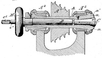 The combination, with a hollow split chuck, C, and a hollow chuck-spindle, B', provided with a hand-wheel, of a stop, D, and a longitudinally-adjustable stem, E, attached to the stop, said stein being extended through the hollow spindle to a point exterior to the said spindle and the band-wheel thereon. |