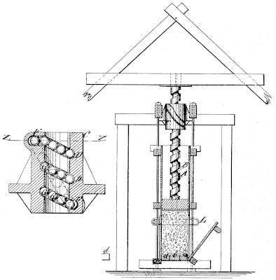 | This patent is the earliest known patent for a recirculating-ball screw mechanism. The patent covers its use as a screw press, perhaps as a cotton press. For more on the development of the recirculating-ball mechanism see patent 477,642. |