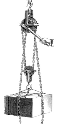 The innovation is a chain-and-pulley arrangement where the lifting force is inversely proportional to the difference in diameter of two pulleys, which are fixed to one another on the same shaft. Making the pulleys very close in size allows a very heavy load to be lifted by hand, and the friction in the mechanism is sufficient to prevent the load from falling under its own weight. A long loop of chain is wrapped around the two pulleys so that two loops of chain hang down. A third pulley is placed at the bottom of one of the loops and the load is attached to the body of that pulley. The remaining loop is used by the operator to raise or lower the load.The inventor exhibited an "Improved pulley block and lifting apparatus" at the 1862 International Exhibition in London. In 1864 he sold the patent rights to Tangye Brothers, who solved two key issues with Weston's invention: chain links were inconsistent in size and would not reliably wrap around a pulley designed to accept chain, and were also prone to getting wedged into the pulley block. Tangye Brothers developed a chain-link designed to easily disengage from the teeth of the pulley, and refined their production methods to produce links of consistent size. See also patent GB-186,502,931 for additional improvements. |