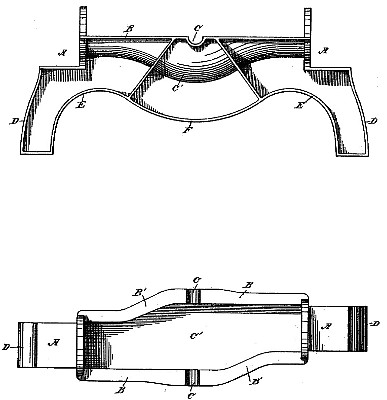 The leading feature of my design is the peculiar outline of the frame in which the two opposing cylinders are fixed, the frame having a peculiar irregular trough shape from the ends to the center and having the two ends out of line with each other on a vertical plane. |