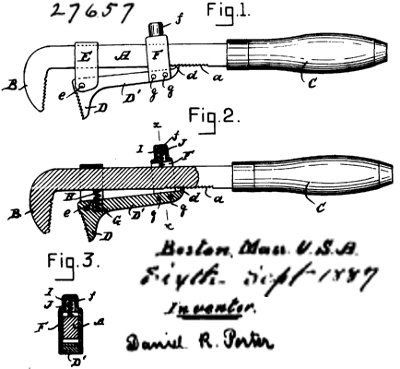 | Quick adjust sliding jaw; a known wrench produced commercially with flat springs rather than the coiled springs shown in the patent drawings is marked Pat. Sept. 25, 1888 -- in reference to corresponding U.S. patent 389,899. |