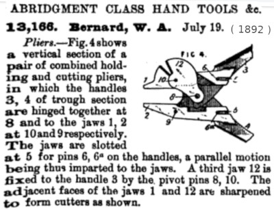 | Entry based on "Abridgment of Specification;" cutters for BERNARD parallel jaw pliers - see entry for U.S. patent 479,113.